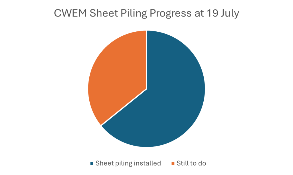 Sheet Piling Update 19 July Progress continues to be made on the CWEM sheet piling. Contractors are 64% through the sheet piling work, and will be working at the northern end of the site for the next 1 1/2 – 2 weeks. Related