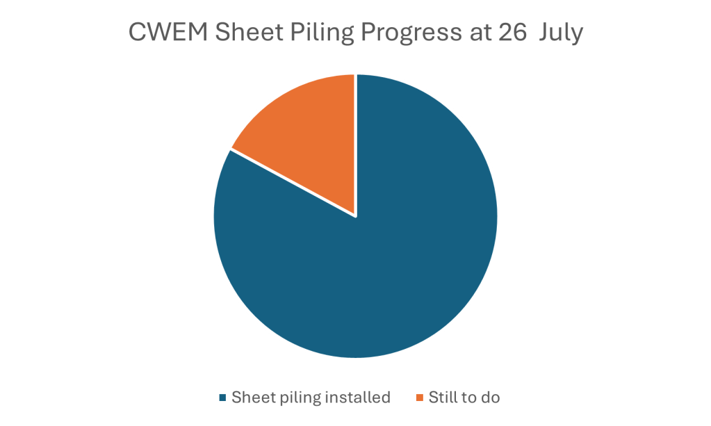 Over the last week the rate of progress on our sheet piling work has slowed a little due to the ground conditions at the western end of the site. Contractors are now 83% through sheet piling work and are expecting to move back to the centre of the site late next week.
